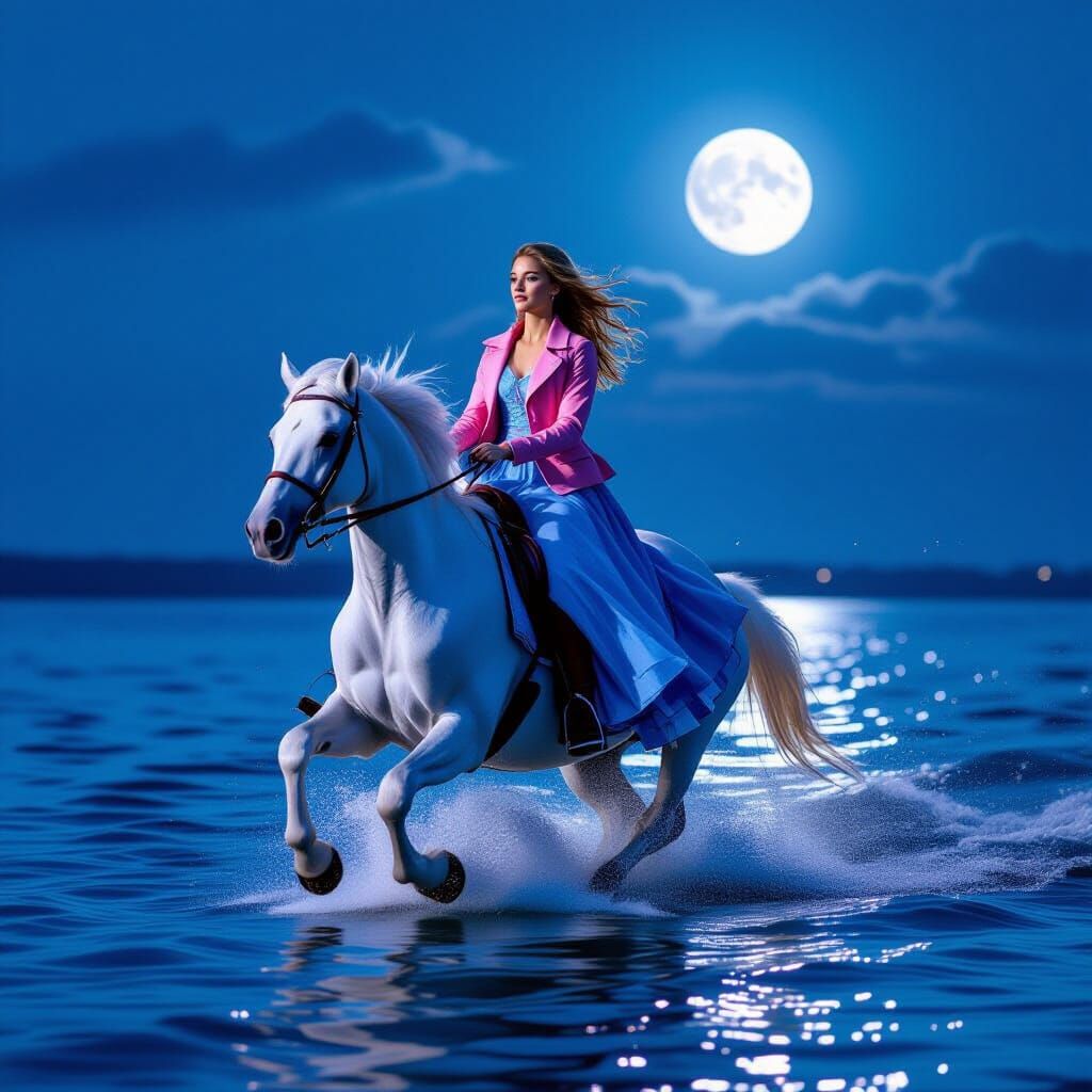This image shows a woman in a pink jacket and blue dress riding a galloping horse through water under the moonlight. The scene evokes a sense of romanticism and adventure.