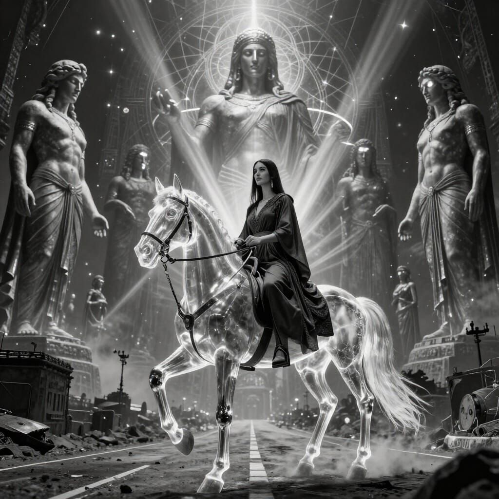 michelangelo painting style, statues guys around, beautiful armenian woman with ultra straight hair, very connected spiritual, riding transparent pur sang horse in the epic road of city of shamballah in background with third eye, ray of lights between characters, ultra deep contrast, ROMA, monochromatic ...