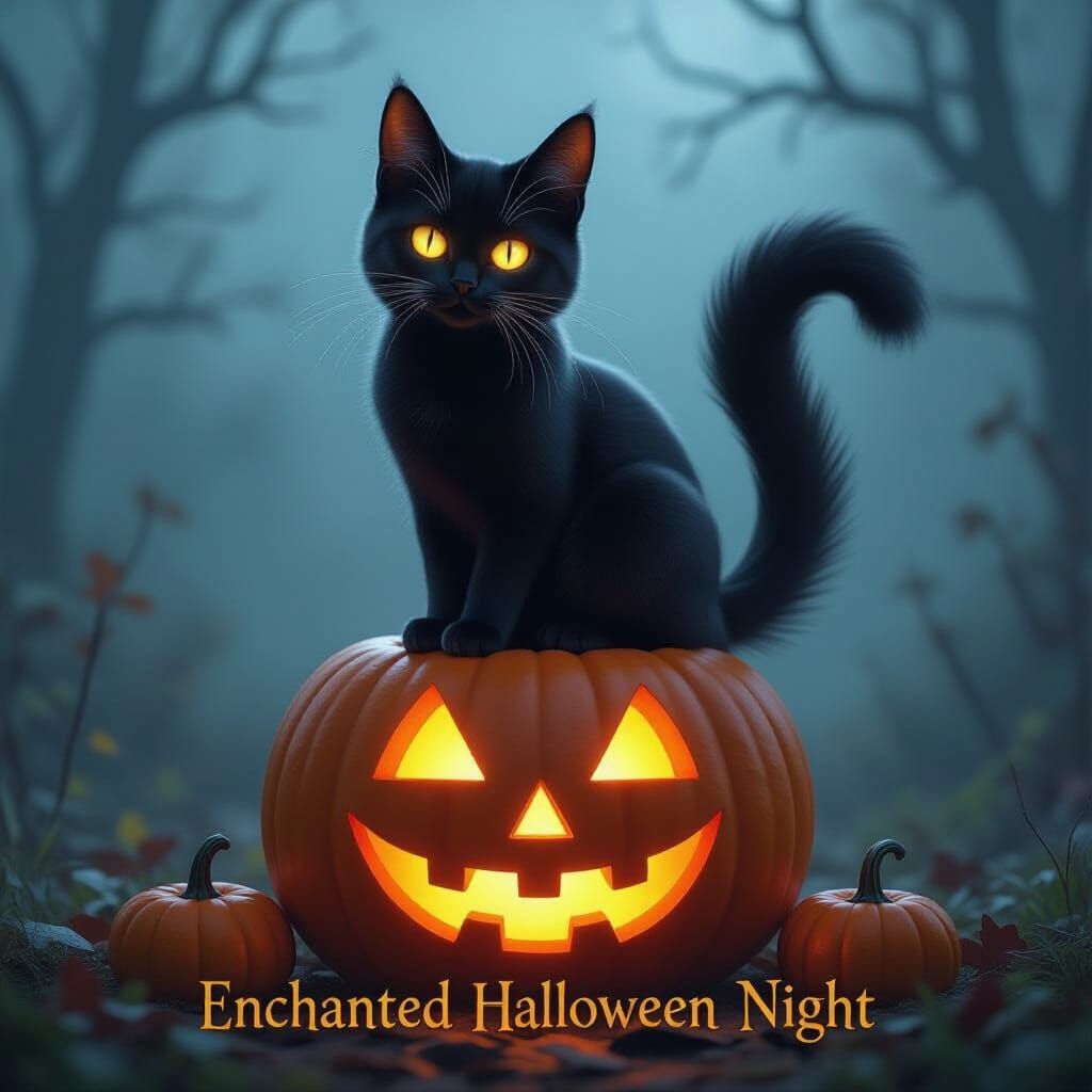 A photo realistic elegant black cat with glowing yellow eyes sits atop a real glowing pumpkin. Its tail is raised and forms an enchanted arc. The inscription appears just below in dark yet charming typography: "Enchanted Halloween Night." A misty, foggy background with a mystical effect. Ultra-detailed, mystical style. Hyper-detailed 3Delight