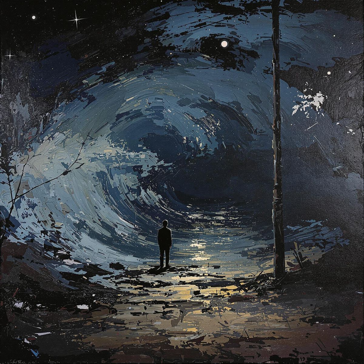 A sorrowful oil painting of a solitary figure at night. The artwork features thick, textured brushstrokes and rich midnight colors, capturing a sense of loneliness in a rustic aesthetic.
