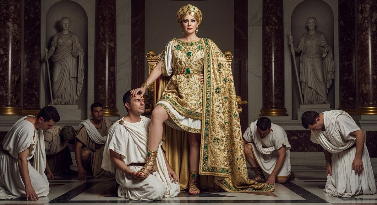 A photorealistic image of a Roman Empress in her palace. She stands over a defeated senator as peasants beg for mercy, captured with sharp focus and natural lighting.