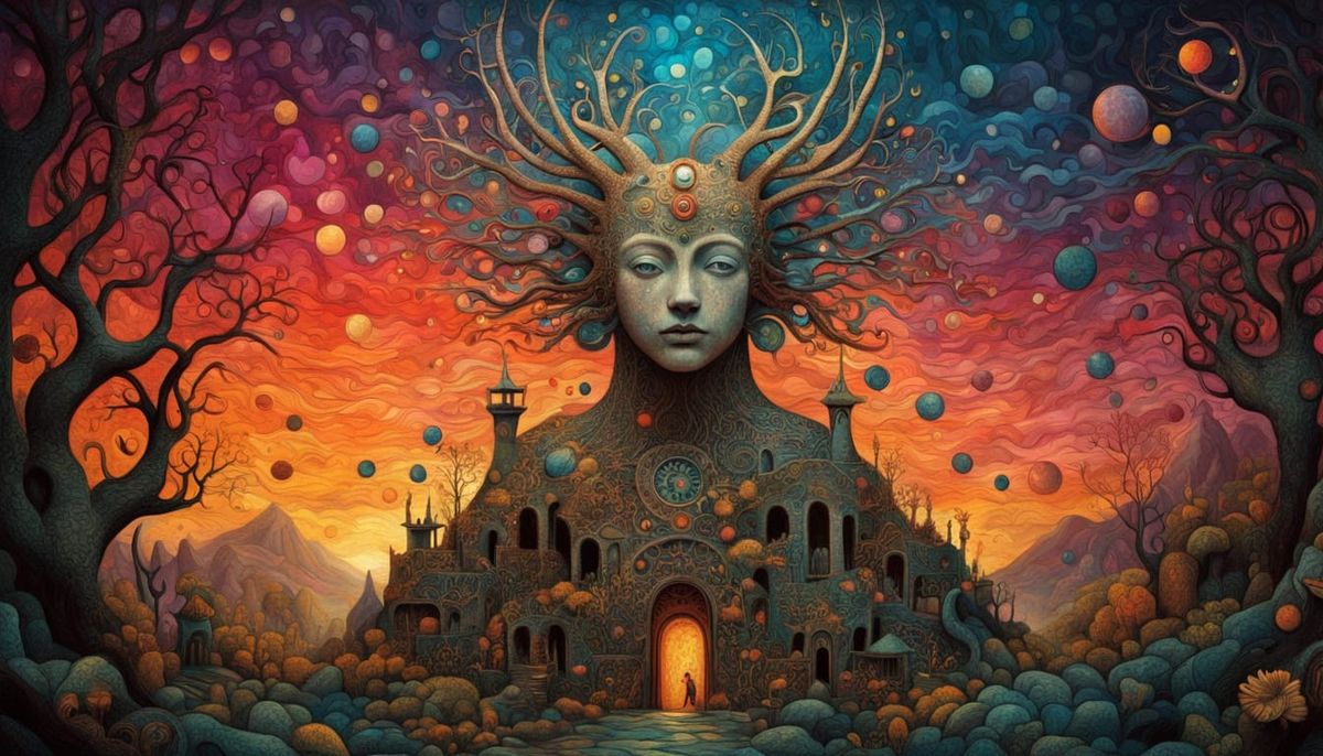 A mystical shaman amidst a fantastical labyrinth, crafted from shattered music and glowing creatures, creates a colorful, intricate sculpture that embodies life and soul, blending Expressionism and Surrealism with vibrant, detailed patterns and textures.