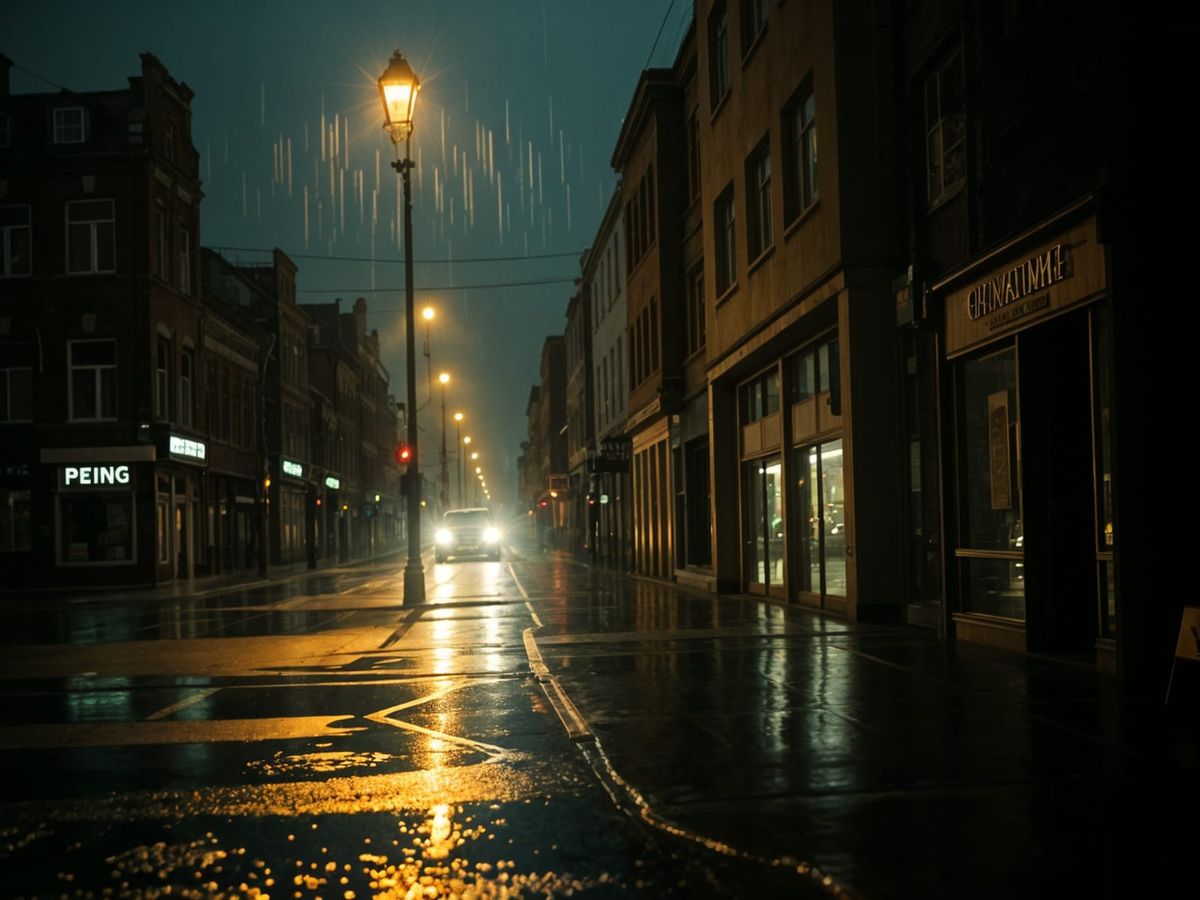 This image is a cinematic film still of a city street during a downpour, featuring atmospheric lighting and a film grain aesthetic.