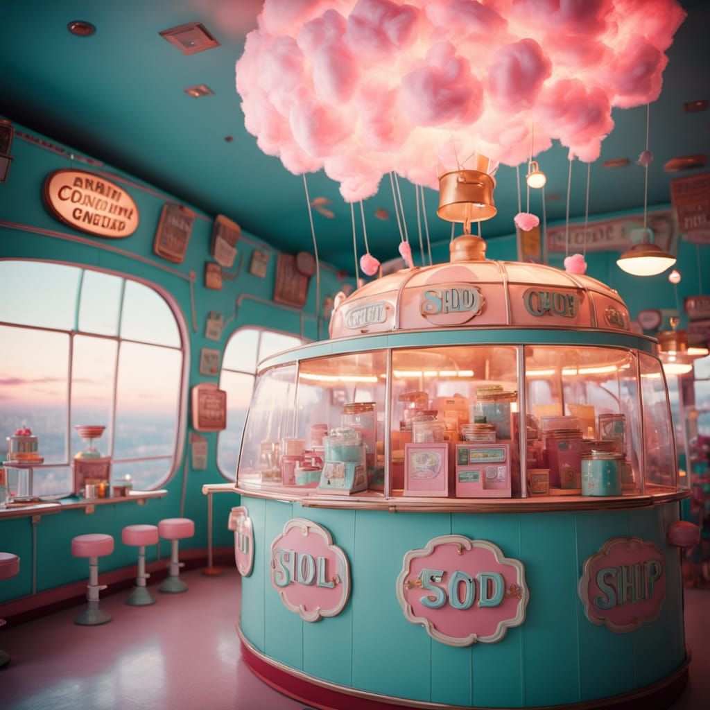 This image shows a whimsical cotton candy shop floating on an airship, rendered in a vintage advertisement style. The scene is bathed in bright pastel colors, soft focus, and a warm, golden glow, reminiscent of a cinematic film still.