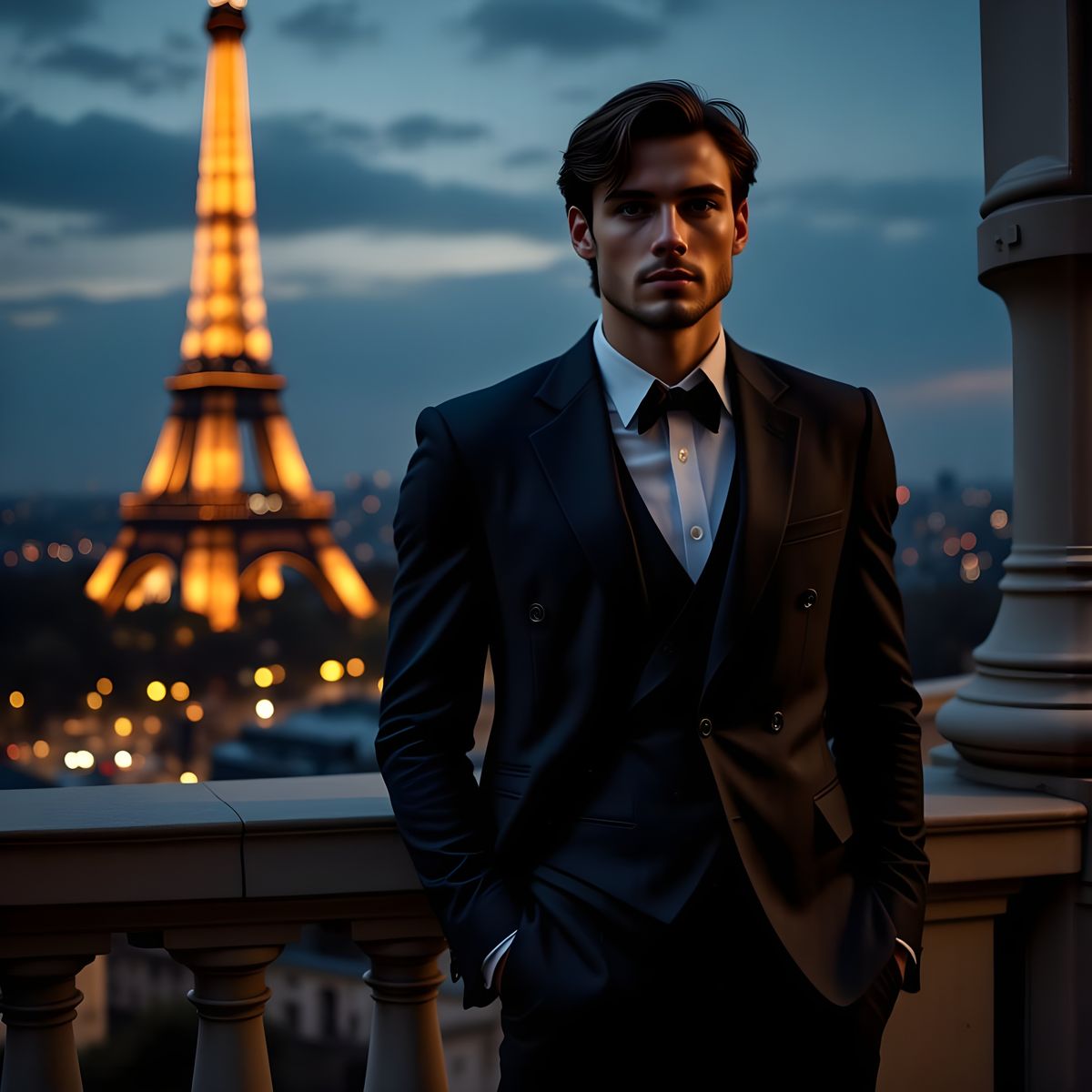 A confident man in a sharp suit stands on a Parisian balcony at dusk, with the Eiffel Tower in the background. Dramatic lighting creates a melancholic, elegant mood.
