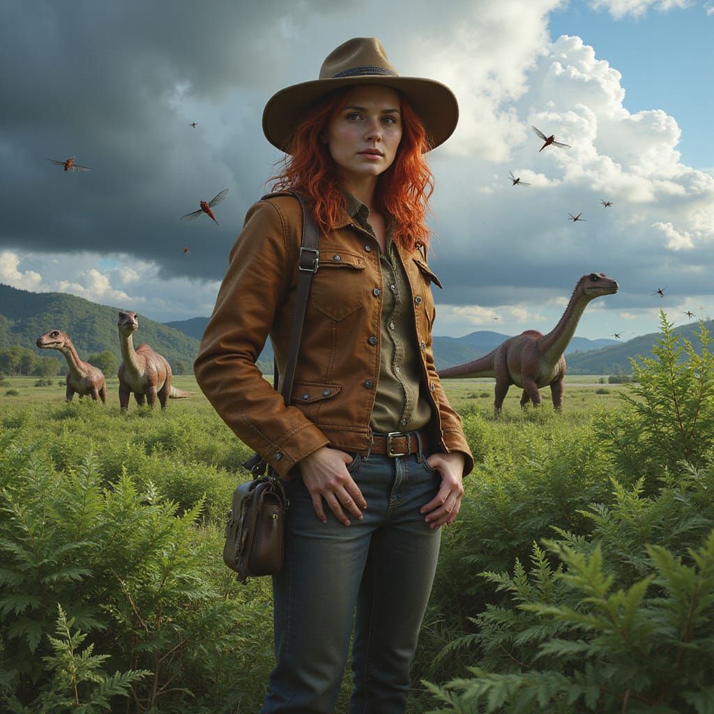 This image shows a captivating scene of a redheaded paleontologist amidst a lush fern prairie, surrounded by small sauropod dinosaurs, under dramatic thunderclouds, with intricate details reminiscent of concept art, created in a detailed matte painting style with deep colors and fantastical elements.