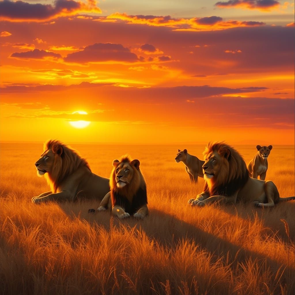 This image shows a pride of lions resting in the golden light of a savannah sunset. The scene features warm colors, dramatic lighting, and a realistic painterly style, evoking the grandeur of nature.