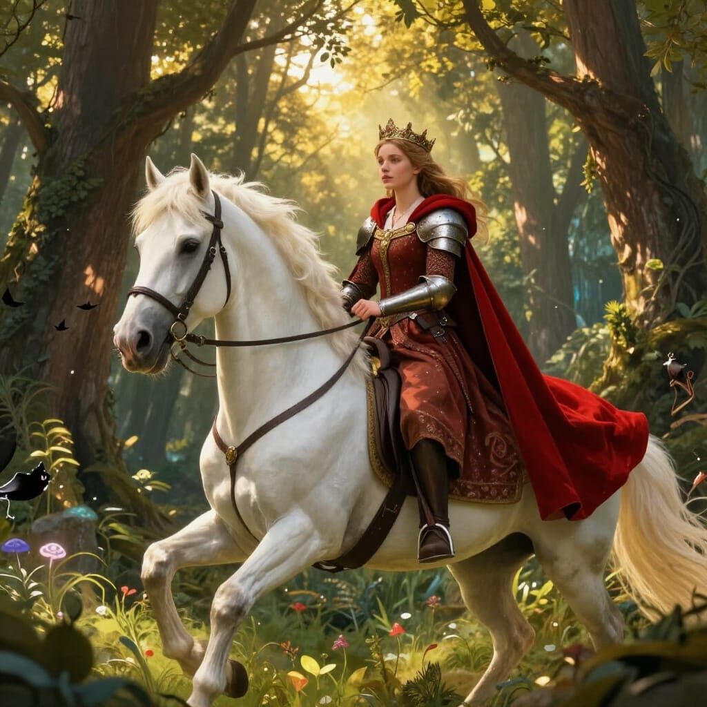 A stunning fantasy art depiction of a queen in medieval attire, riding a white horse through a sunlit enchanted forest. Features vibrant colors and dramatic lighting.