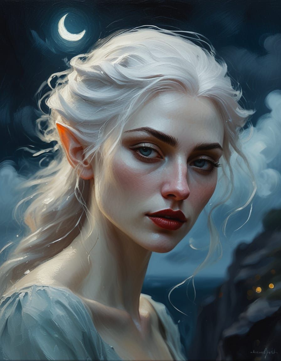 This impressionist oil painting captures an elf with platinum hair on a cliff at night. Moonlight illuminates her face amidst swirling clouds, creating an ethereal and mysterious atmosphere.