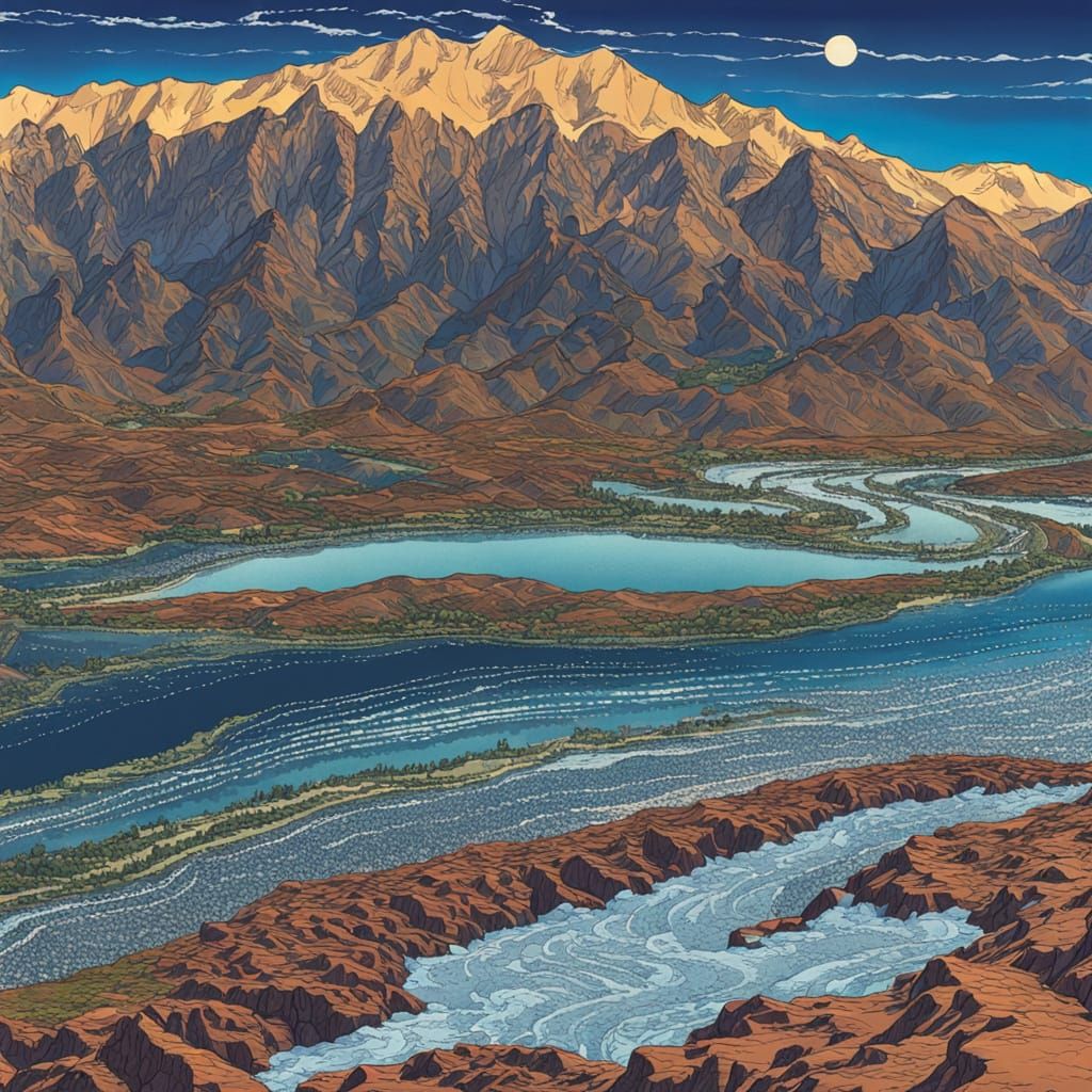 This image shows a unique bead bracelet design featuring shimmering iridium rivers winding between two majestic mountains. A striking piece of wearable art.