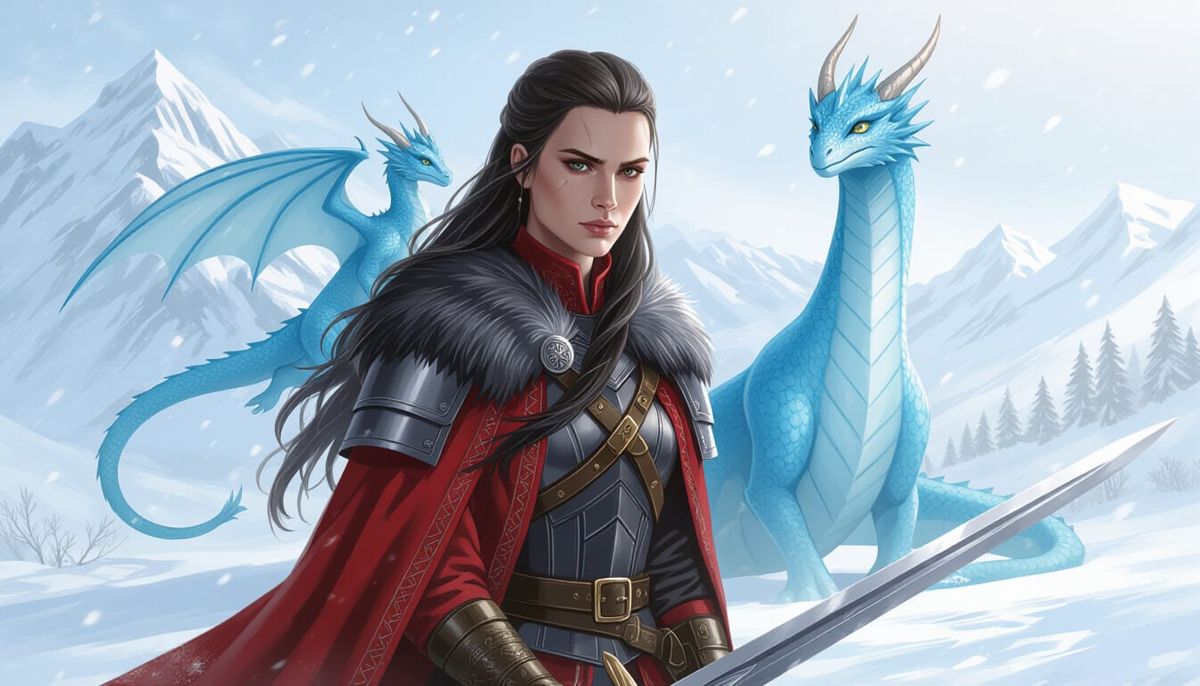This image shows a fantasy warrior in a red coat with a dragon on her shoulder, facing a larger dragon in a snowy scene. Rendered in a concept art style with dramatic lighting and a rich blue and red palette.