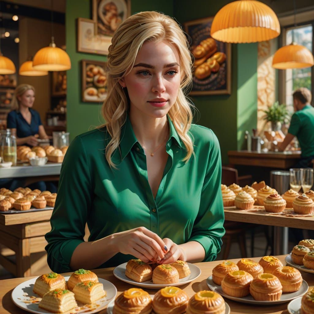 This image shows a blonde woman in a green blouse seated at a table laden with pastries. The scene is depicted with vibrant colors, intricate textures, and soft, cinematic lighting.