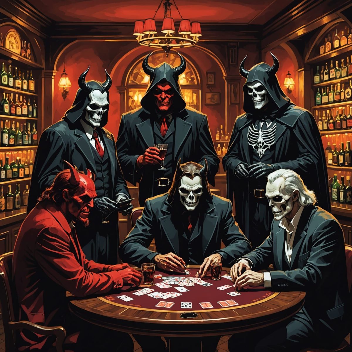 A surreal scene unfolds as the devil, angel, and grim reaper gather at a dimly lit bar, their poker game illuminated by the barkeeper's mixing skills.