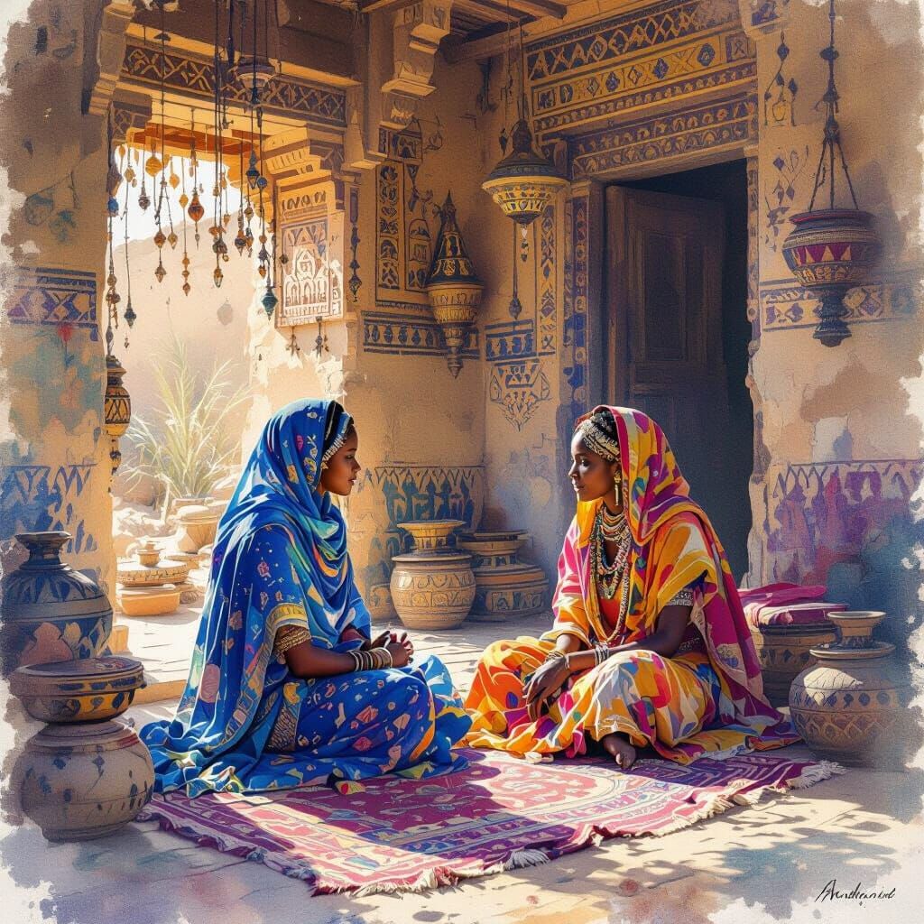 This image shows a Nubian girl and her mother in a richly decorated home, created with soft watercolor washes and deep, complementary colors for a fantastical feel.