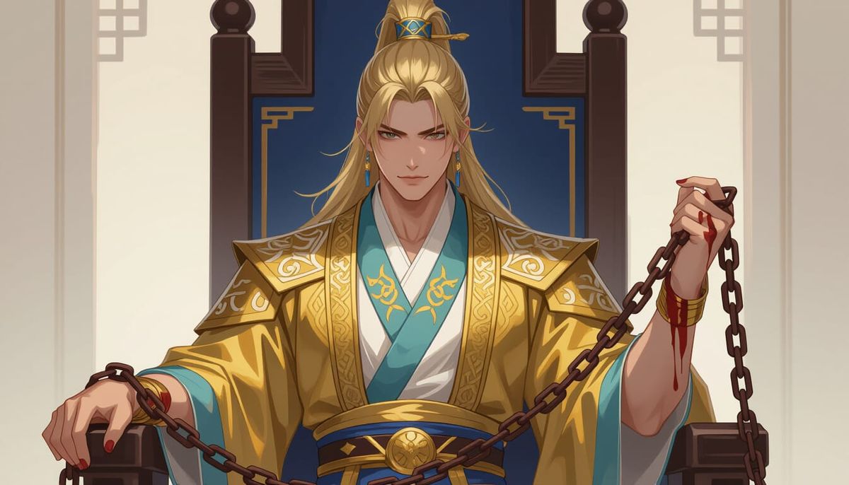 This image shows a handsome young man with long golden hair bound to a throne by chains. He wears traditional golden and blue clothing in a 2D anime style, creating a tense, mysterious atmosphere.