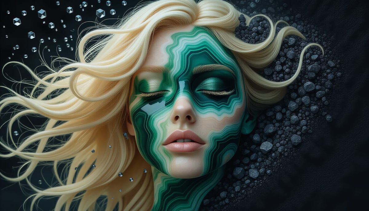 This hyper-realistic photograph features a blonde face sculpted from swirling green and black agate. Hexagonal raindrops refract light across the stone, creating a crystalline effect against a dark background.