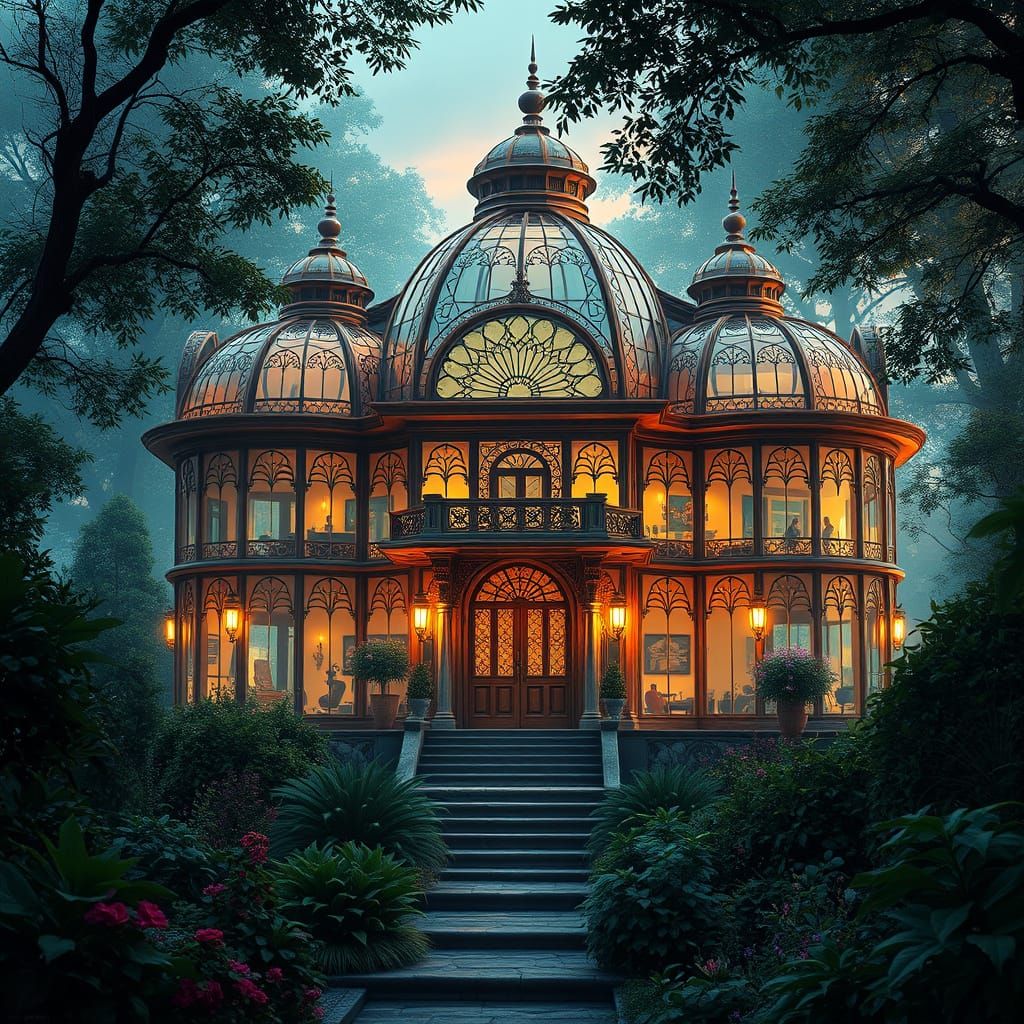 This image shows a meticulously designed glass house enveloped by abundant vegetation. The aesthetic blends fantasy realism with vibrant digital painting, futuristic concept art, and elegant art nouveau elements.