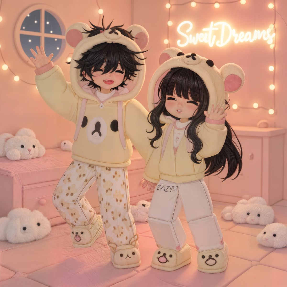 This image shows an anime couple in bear hoodies in a pastel bedroom. The illustration captures a dreamy, cozy atmosphere with fairy lights and plushies, rendered with soft, warm lighting.