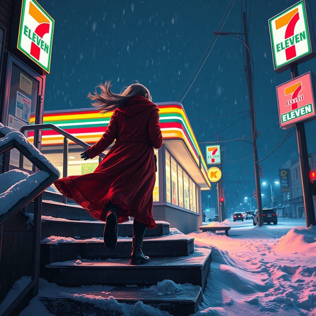 A hyperrealistic image of a woman in a vibrant coat rushing up the steps to a brightly lit 7-Eleven on a cold winter night. The scene is rich with atmospheric lighting.