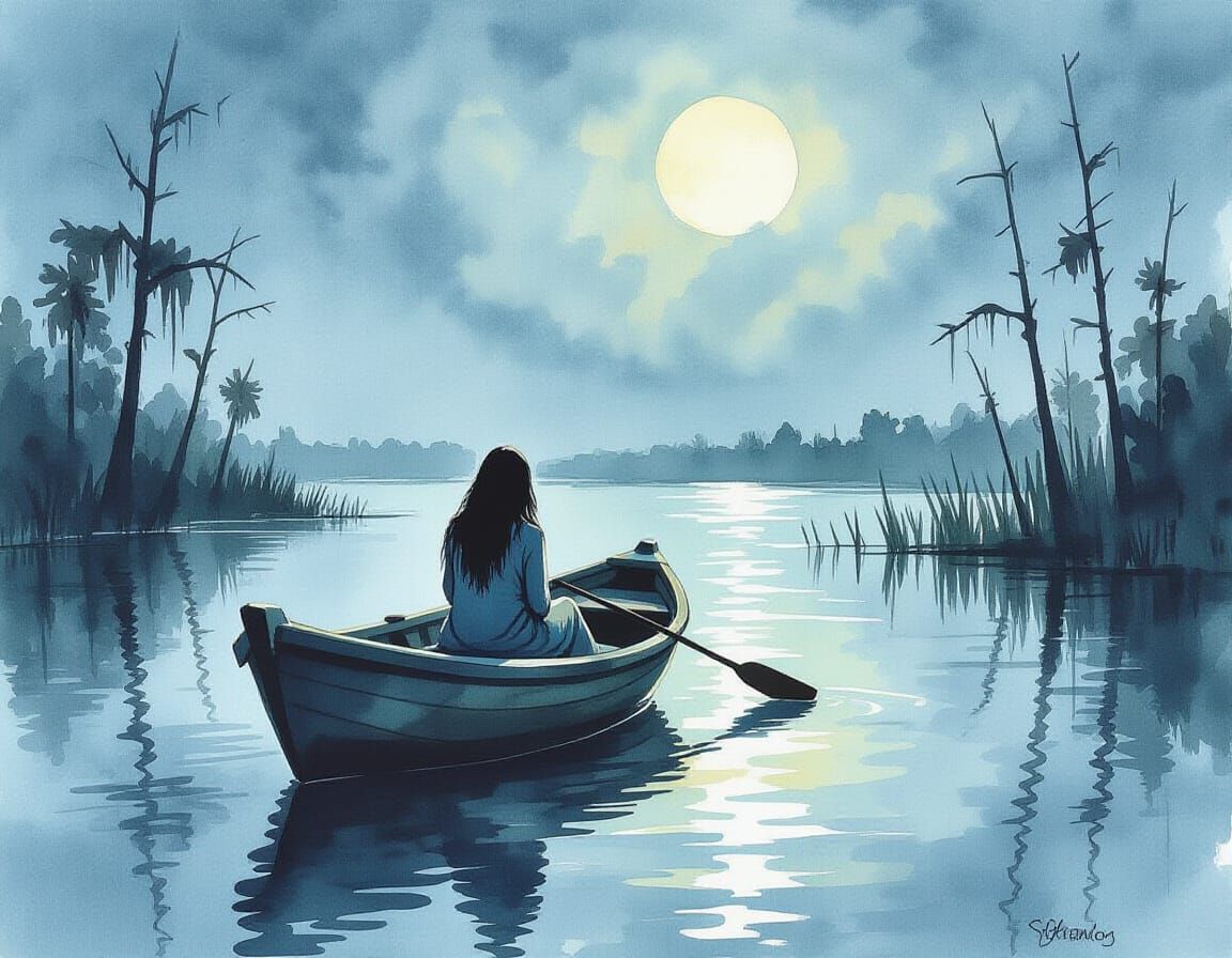 This image shows a solitary woman in a small fishing boat drifting through a bayou under dim moonlight. The scene has a somber, eerie quality, rendered in watercolor style.