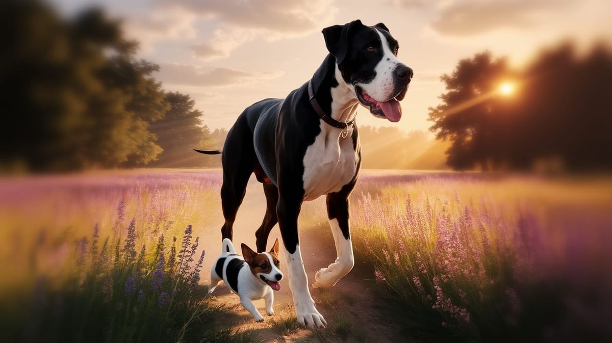 This image shows a Great Dane walking through a flower field with a Jack Russell Terrier. The scene is bathed in warm sunlight with a shallow depth of field, reminiscent of alcohol ink and concept art.