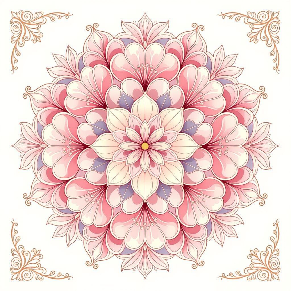 A symmetrical mandala featuring pink flowers and soft petals. The design incorporates pale pinks, blush tones, lilacs, and gold accents, with organic curves and whimsical patterns in an elegant, dreamy style.