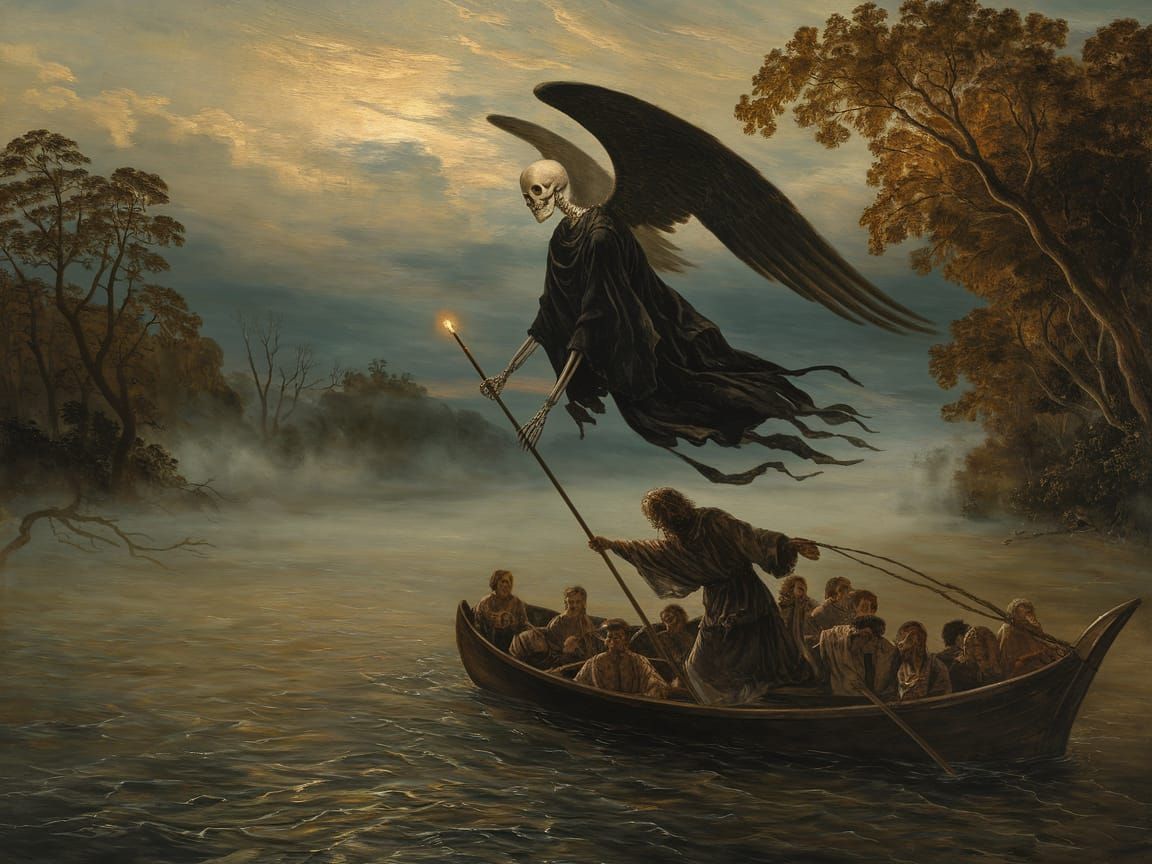 A haunting Pre-Raphaelite oil painting of the Angel of Death guiding souls onto Charon's ferry, set against a misty twilight sky with lush, somber trees and intricate brushwork