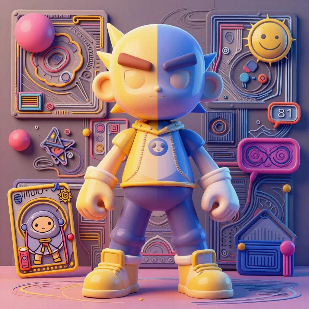 This image blends 3D sculpting with 2D illustration, featuring a character with sharp outlines against textured backgrounds. Vivid colors emphasize dimensional interplay, inspired by animated films and graphic novels.