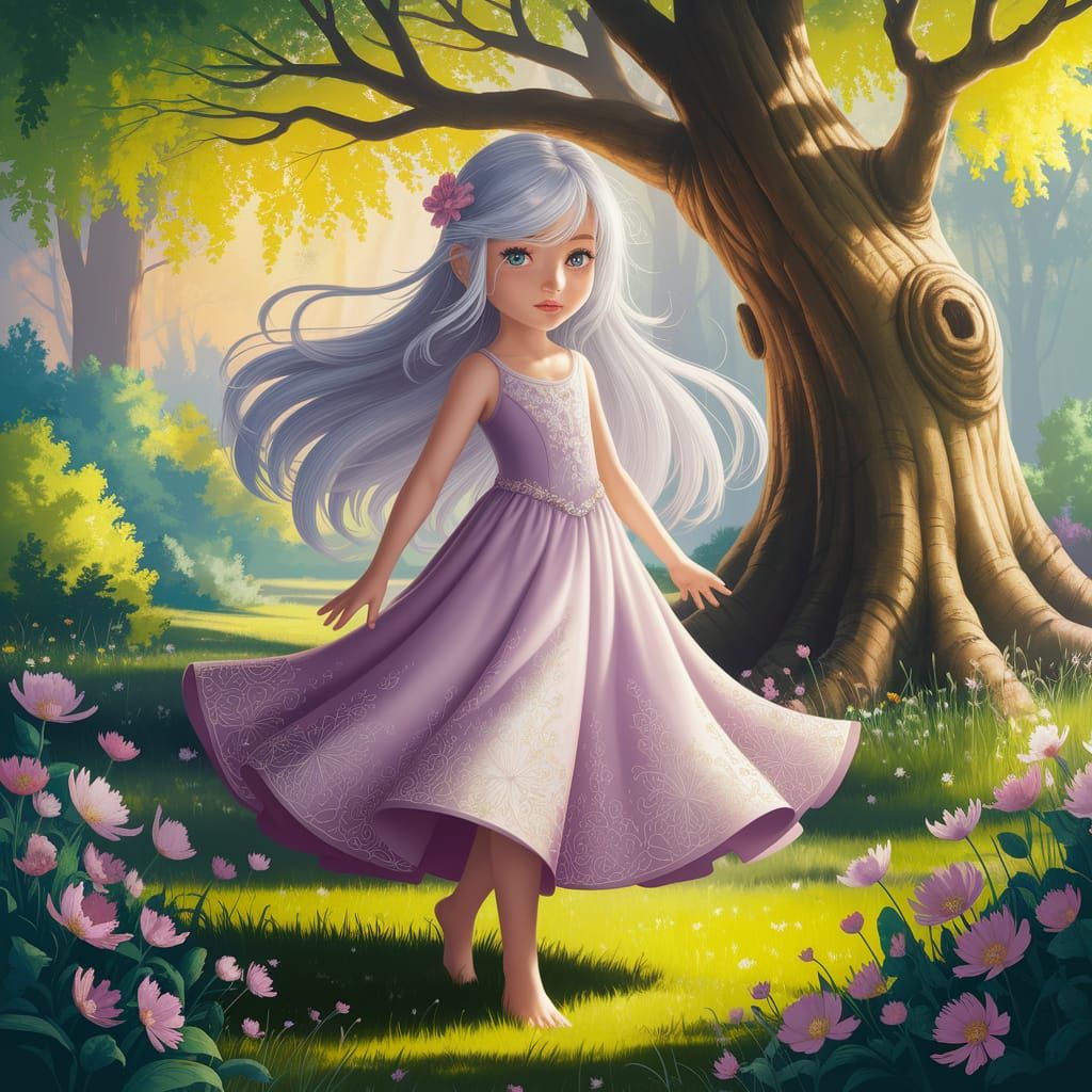 This image shows a serene and mystical scene of a young girl standing under a majestic tree in a sunlit forest, surrounded by lush greenery and glowing flowers.
