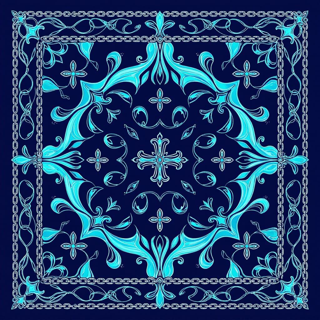 A square silk bandana design featuring bold crosses, baroque ornaments, and chain borders on a deep navy background with aqua and turquoise accents, in a seamless textile illustration style.