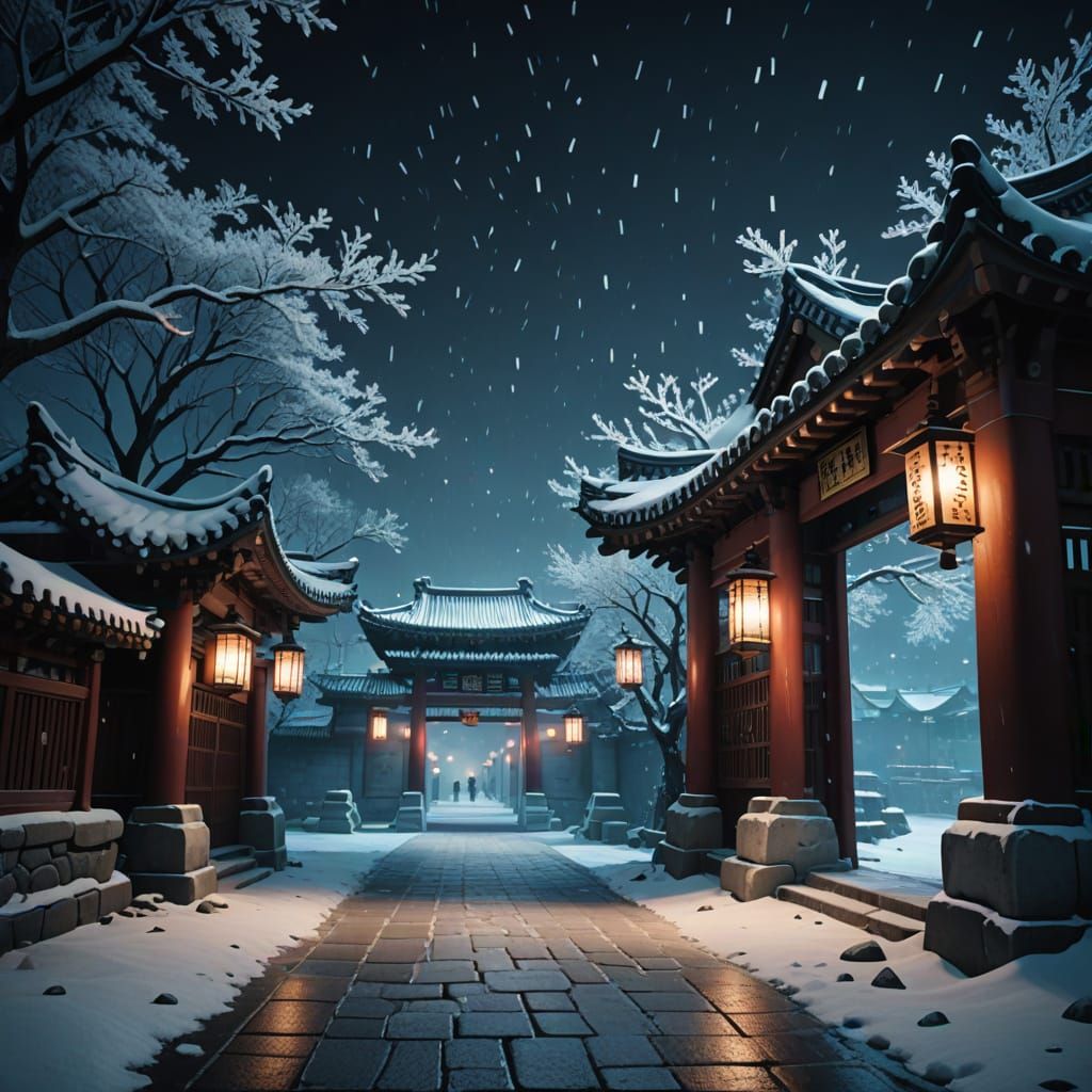 This image shows Namdaemun Gate in winter, depicted in an anime-inspired 3D style. Soft lighting illuminates the frozen stone, with snowflakes gently falling in cold blue tones.