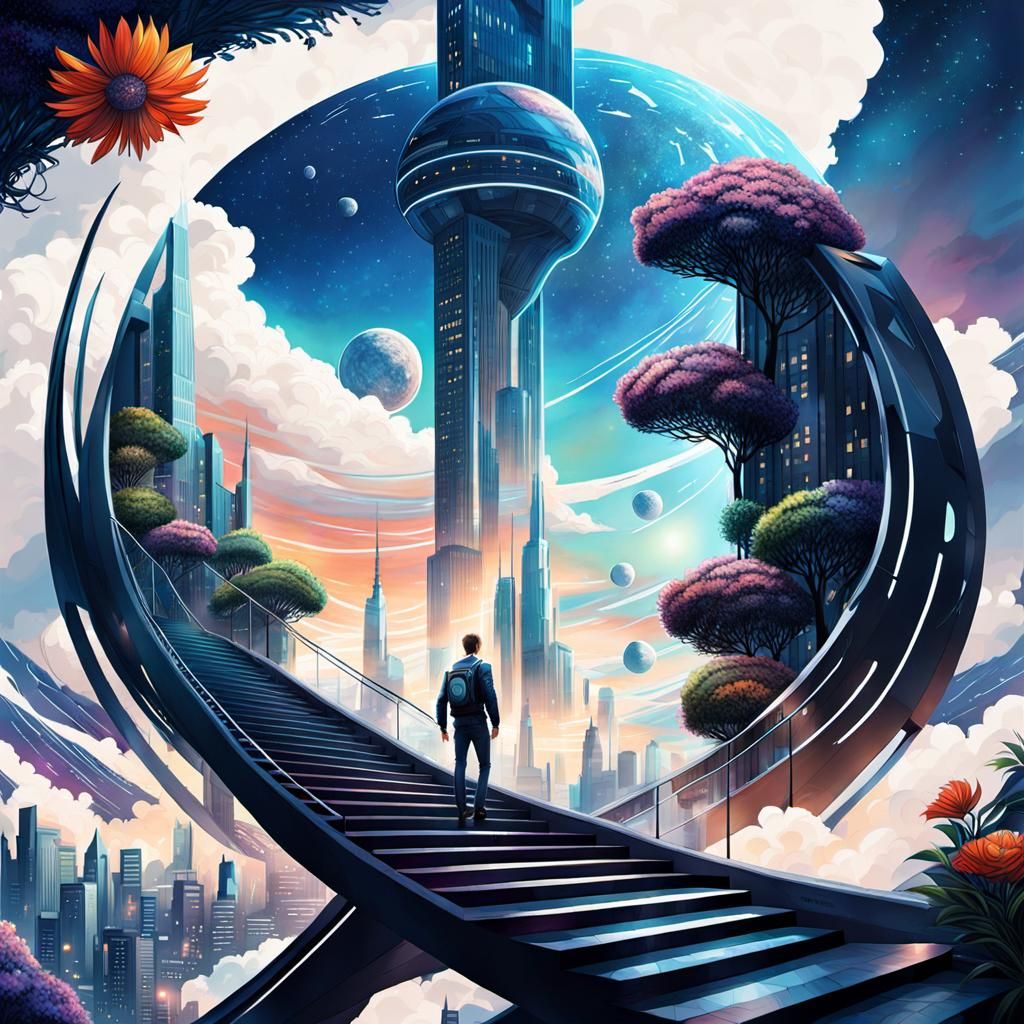 A vibrant image of a young man in a futuristic cityscape. This digital artwork features detailed architecture and a surreal, space-themed stairway, rendered in a maximalist aesthetic.