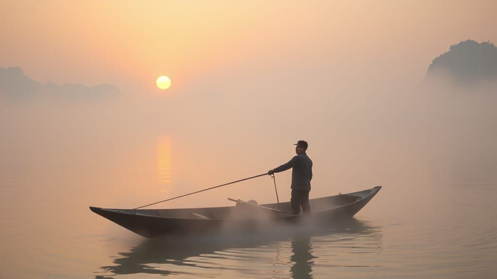 This image shows a tranquil scene of a Chinese man fishing from a boat, almost hidden by heavy mist. The landscape is painted in soft, ethereal tones, reminiscent of atmospheric landscape art.