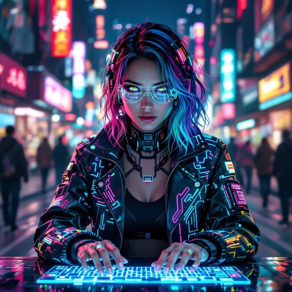This image shows a woman with rainbow hair in a futuristic city. She is wearing a jacket with glowing circuits and using a holographic keyboard, all rendered in a cyberpunk aesthetic.