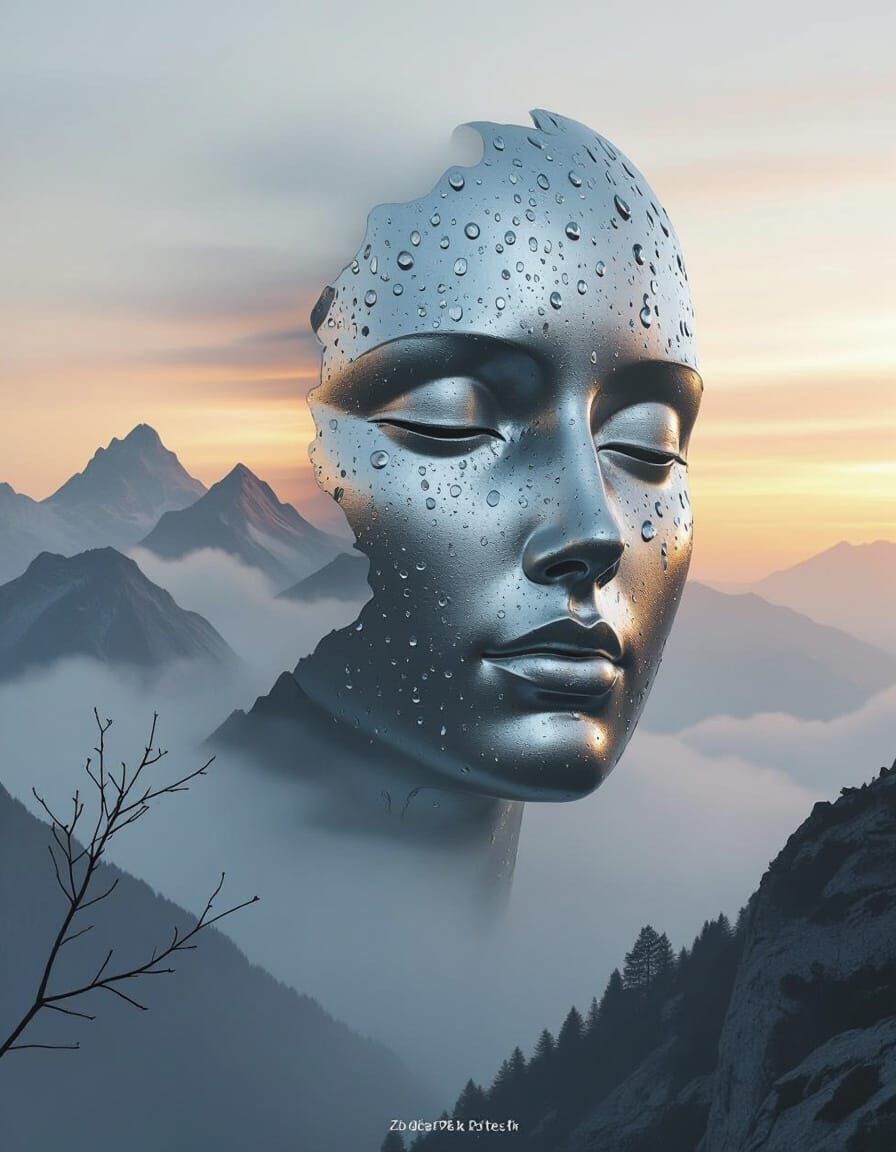 A contemplative, sculpted human face emerges from misty mountains at sunset, textured with water droplets. Rendered in a surreal digital matte painting style with muted colors and a shallow depth of field.