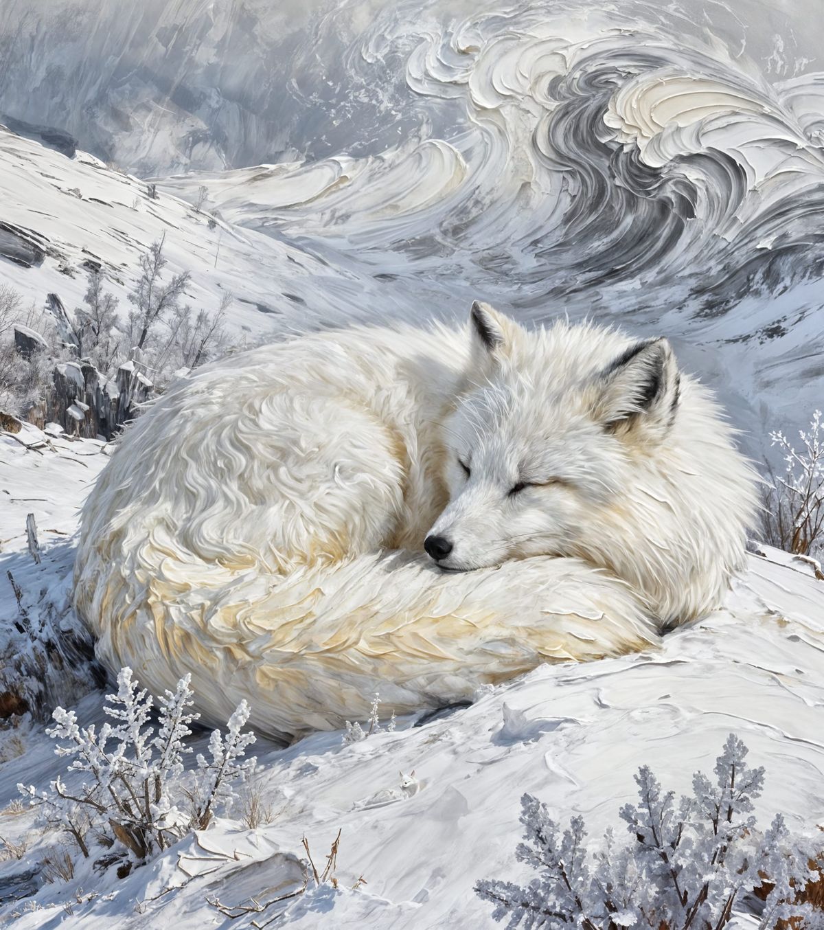 This image showcases a white Arctic fox in thick impasto oil paint. Visible brushstrokes and textural depth highlight its winter coat and snowy surroundings.