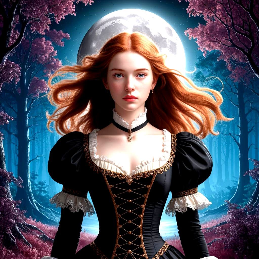 A captivating image of a young redhead in Victorian attire. She stands in a moonlit forest with an expression of serenity. The image is a detailed matte painting with magical realism.