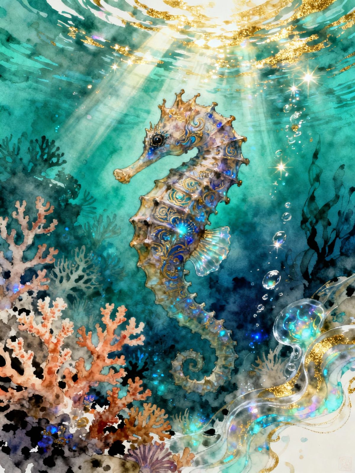 This image shows a majestic hippocampus swimming through a vibrant coral reef in a magical underwater world. Sparkling sunbeams create a mystical aura, rendered in a watercolor and ink style.