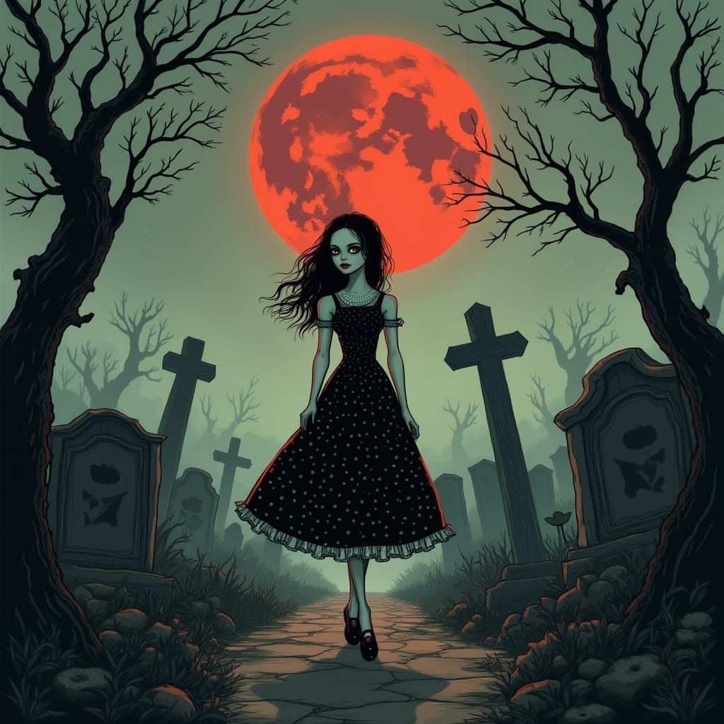 This image shows Wednesday Addams in a polka dot dress in a moonlit graveyard. This artwork evokes a gothic art style with bold lines and muted colors, creating an eerie yet whimsical atmosphere.