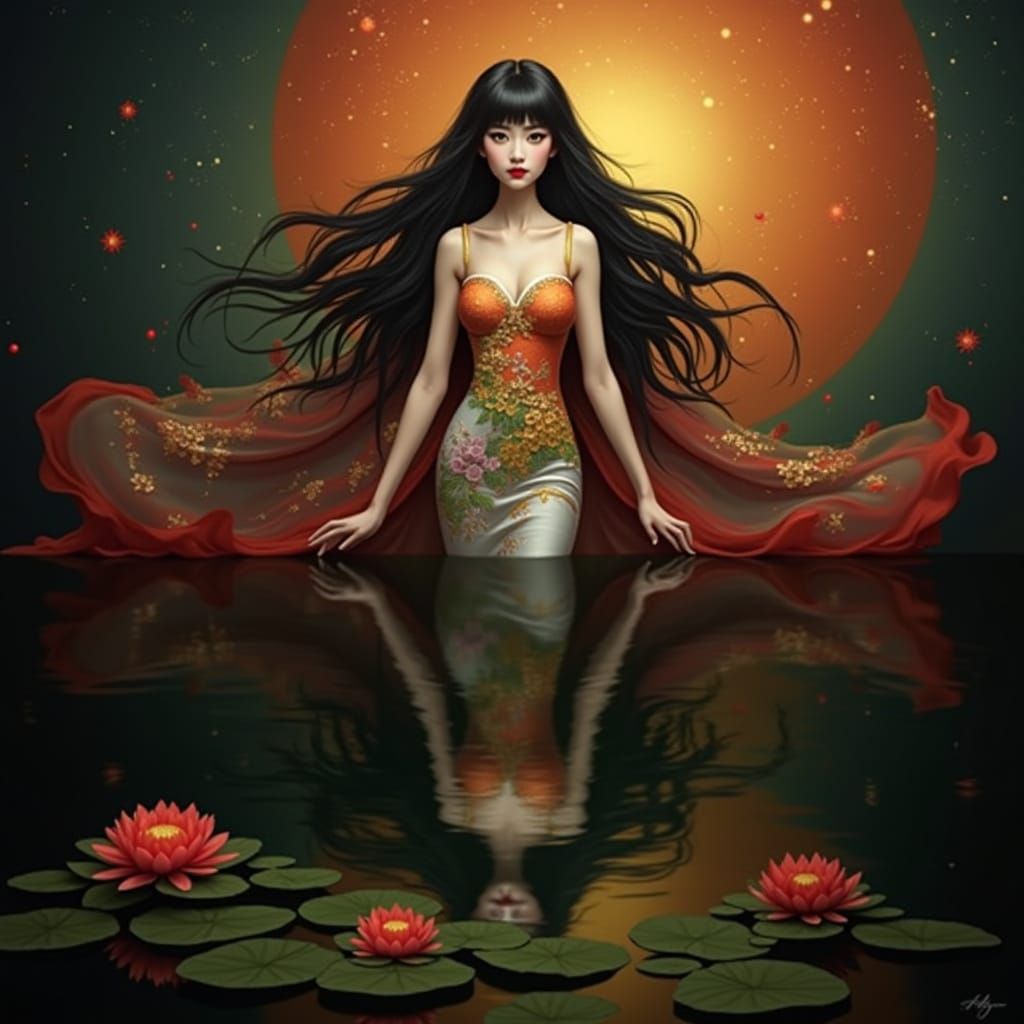 This image shows a hyperrealistic portrait of a geisha with black hair and green eyes, wearing a colorful dress. The geisha touches a mirrored reflection, surrounded by golden motifs and a cosmic background.