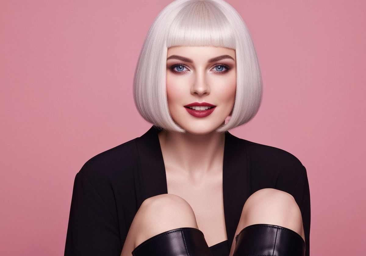 A striking picture of a young woman with porcelain skin wearing a black dress, boots and blindfold. Her stylish bob and makeup are enhanced by a romantic, golden pink light in a luxury beauty campaign aesthetic.