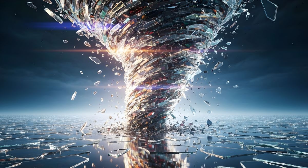 a supermassive tornado made of large shattered pieces of coloured broken glass sweeps across a vast mirrored landscape at night, detailed and accurate light reflections reflect off the broken glass creating a mesmerising display of lens flare, volumetric lighting, volumetric shading, depth of field, ...