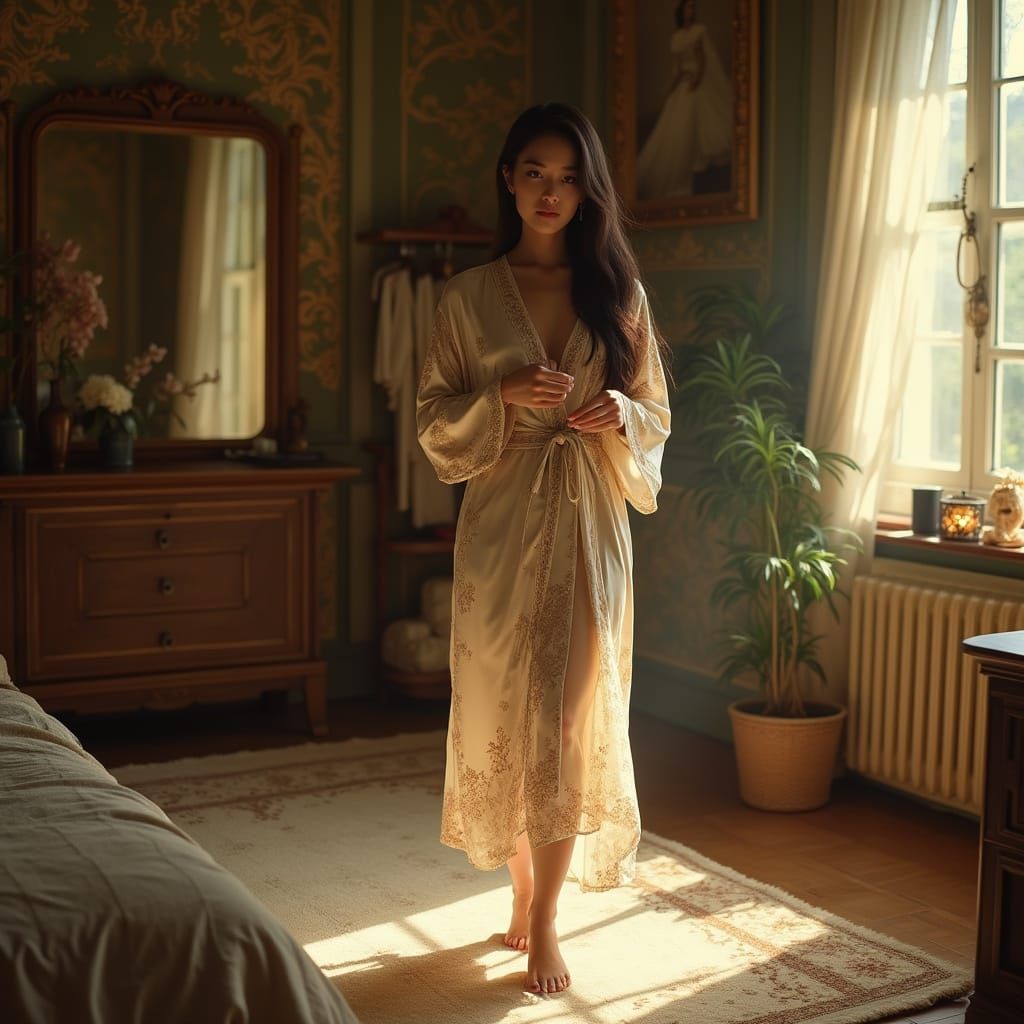 This image shows a serene Asian woman in a cozy bedroom, surrounded by soft lighting and intricate patterns, as she prepares to get dressed in a elegant silk robe.