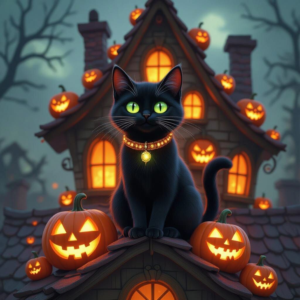 A striking picture of a black cat with green eyes perched on a jack-o'-lantern house. This whimsical scene features glowing pumpkins and shadows, as 3D rendered digital art.