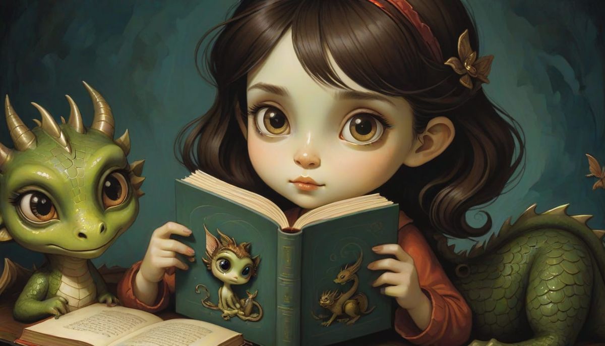 A colorful painting of a girl reading a book with her pet dragon. This whimsical portrait features a painterly impasto style and is reminiscent of storybook illustrations.