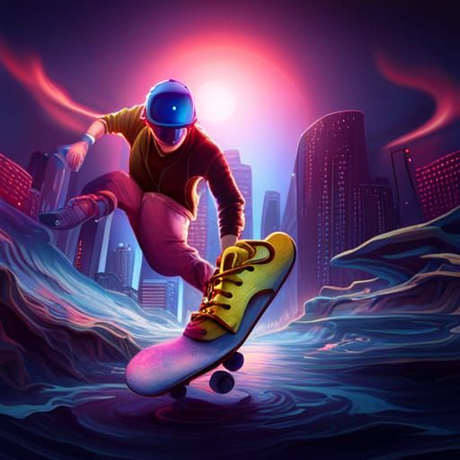 A vibrant and detailed matte painting of the Snapchat logo with a skateboard and filming camera. The image features deep colors and intricate details, rendered in 8k resolution, reminiscent of fantasy concept art.