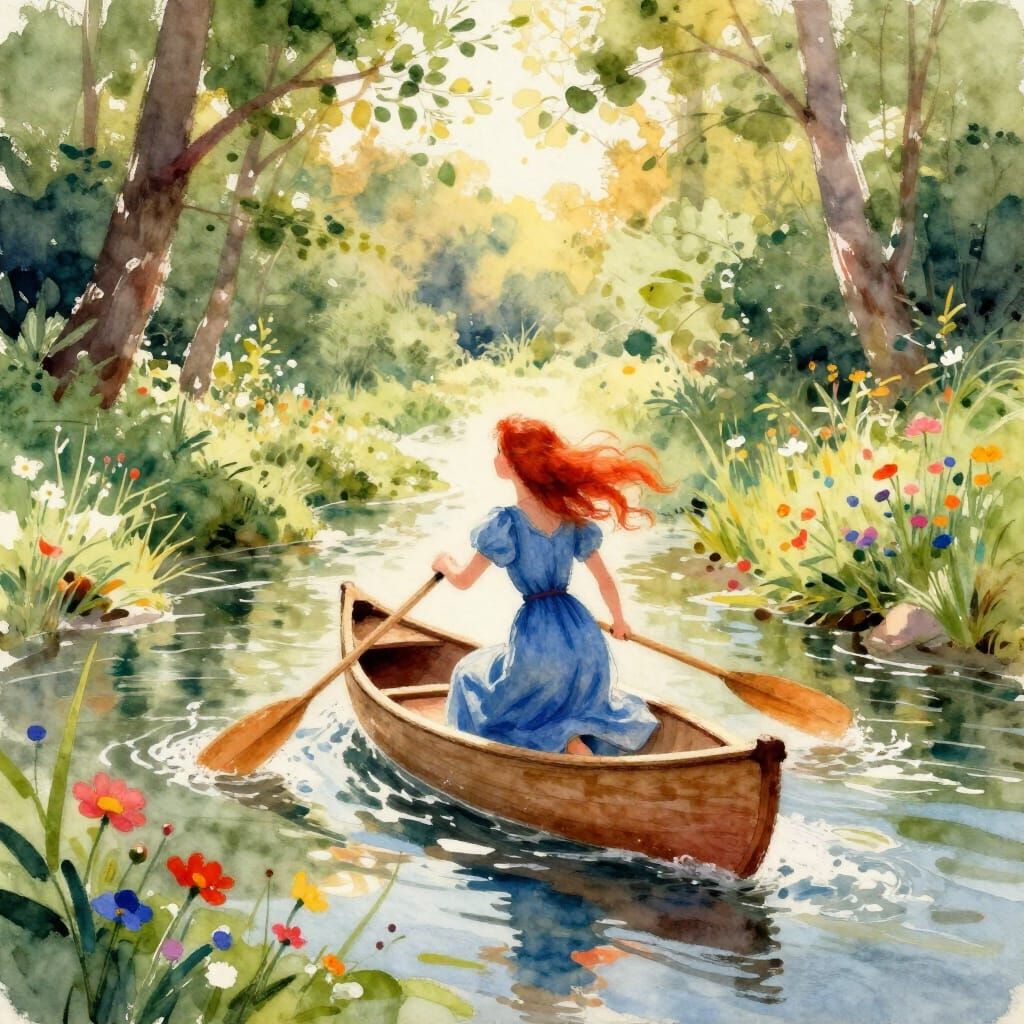 This image shows a woman in a blue dress with red hair, paddling a canoe on a stream. It features lush nature, golden light, and a loose, expressive watercolor style with bleeding colors and visible brushstrokes.