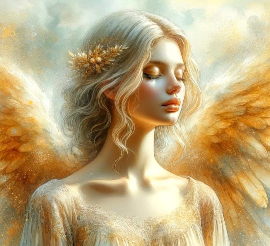 This image shows a serene woman with ethereal features, pale skin, and golden hair, surrounded by delicate watercolour brushstrokes and gilded spatters, set against a soft spring dawn backdrop.