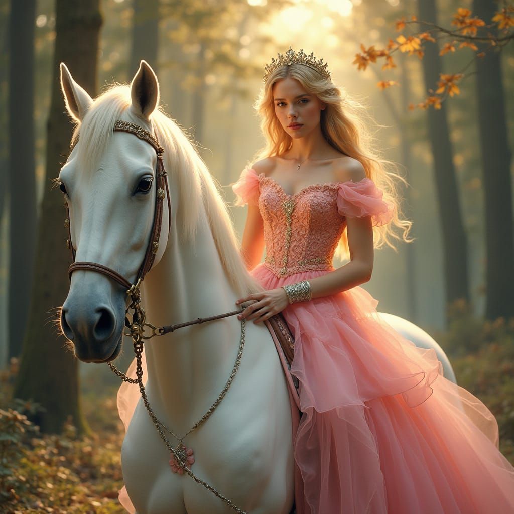 A captivating image of a princess in a pink gown riding a white horse, her face conveying sadness. The backdrop features a misty forest at sunset, rendered with a romantic aesthetic.