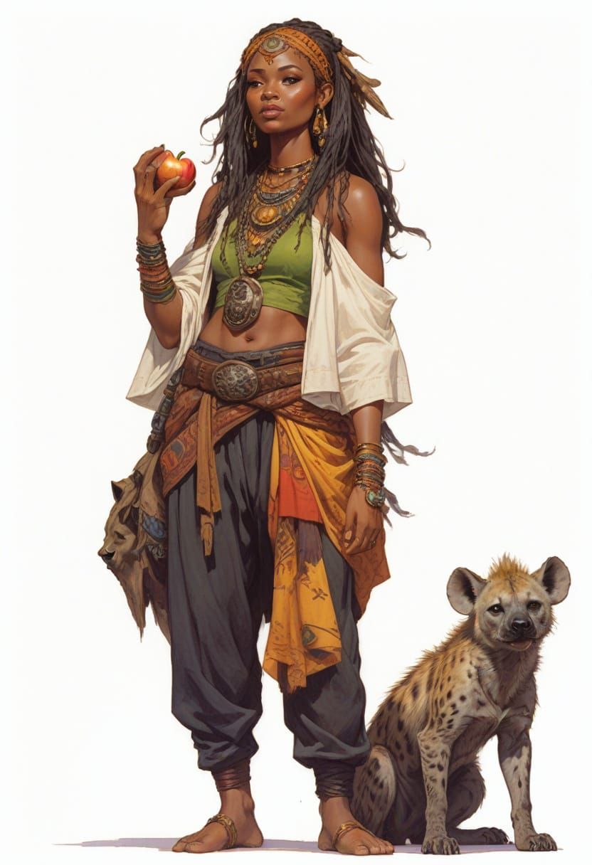This detailed illustration features a young Black African woman with white hair, dressed in vibrant, traditional Angolan-inspired attire, standing with her pet hyena. The artwork is rich in color and detail, reminiscent of classic fantasy art.